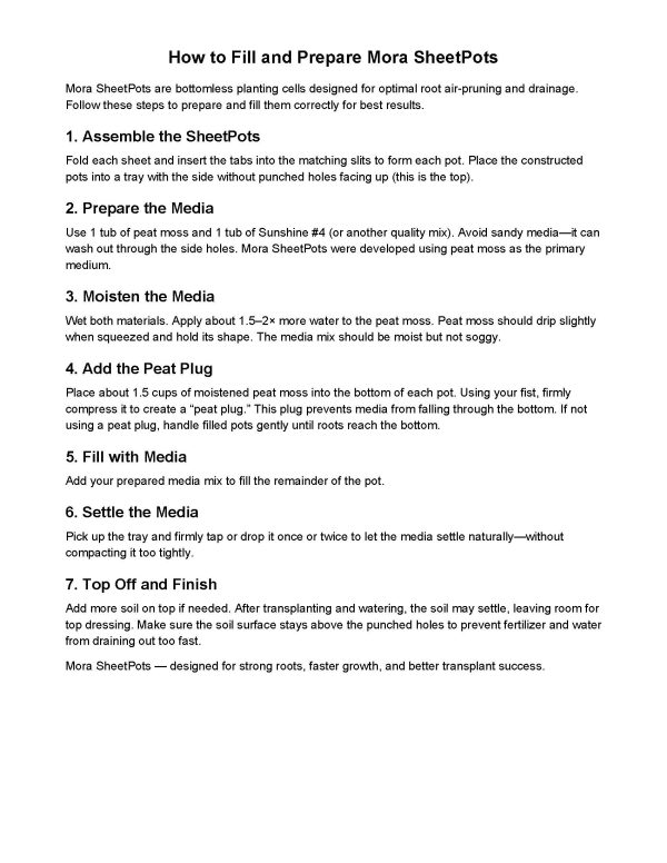 SheetPots are ideal for propagating trees, shrubs, and other vegetation in resource-limited settings or remote locations where shipping space and cost are critical.They are shipped unassembled.The SheetPots are not designed to stand alone, a tray is required to support them.Tray that works well for this pot and the quantity per tray are as follows.SP6T - 6Mora SheetPot Instructions